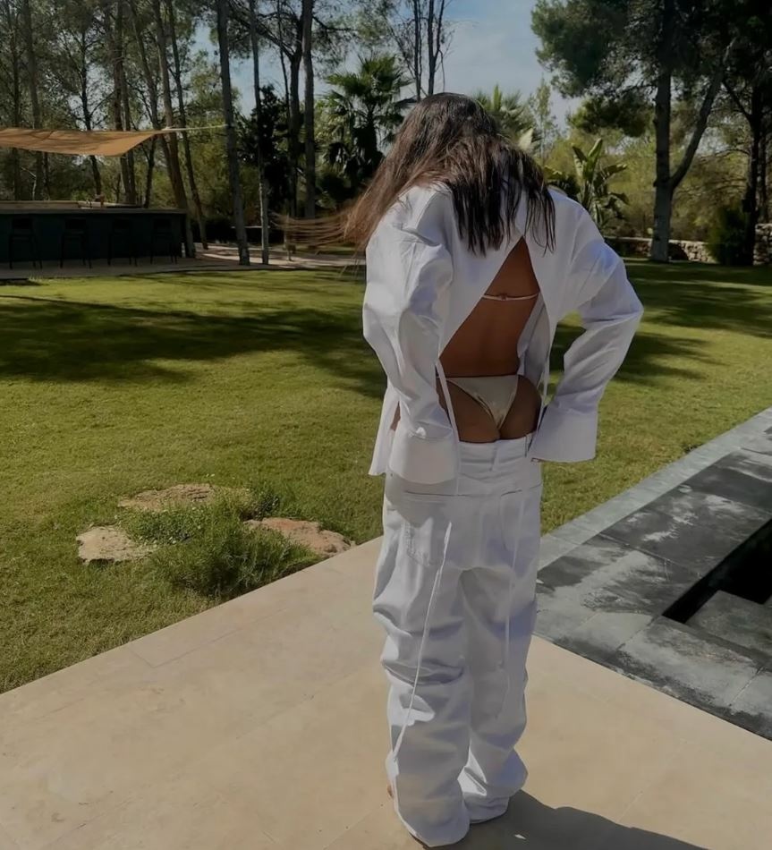 Tek një pozë ajo shihet teksa ka ekspozuar të pasmet e saj, duke ngritur pantallonat, shkruan Arbresh.info