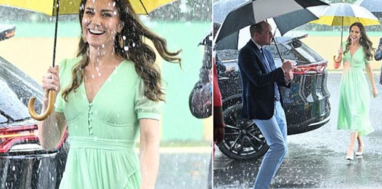 Kate, e cila kishte veshur një fustan nga marka “Self Portrait” dhe stoli të stilistit “Bahamian” nga Nadia Irena, tha ndërsa ecte nën një ombrellë në shi: “Oh zot. Moti, më falni, ne kemi sjellë shiun e Anglisë me vete”.