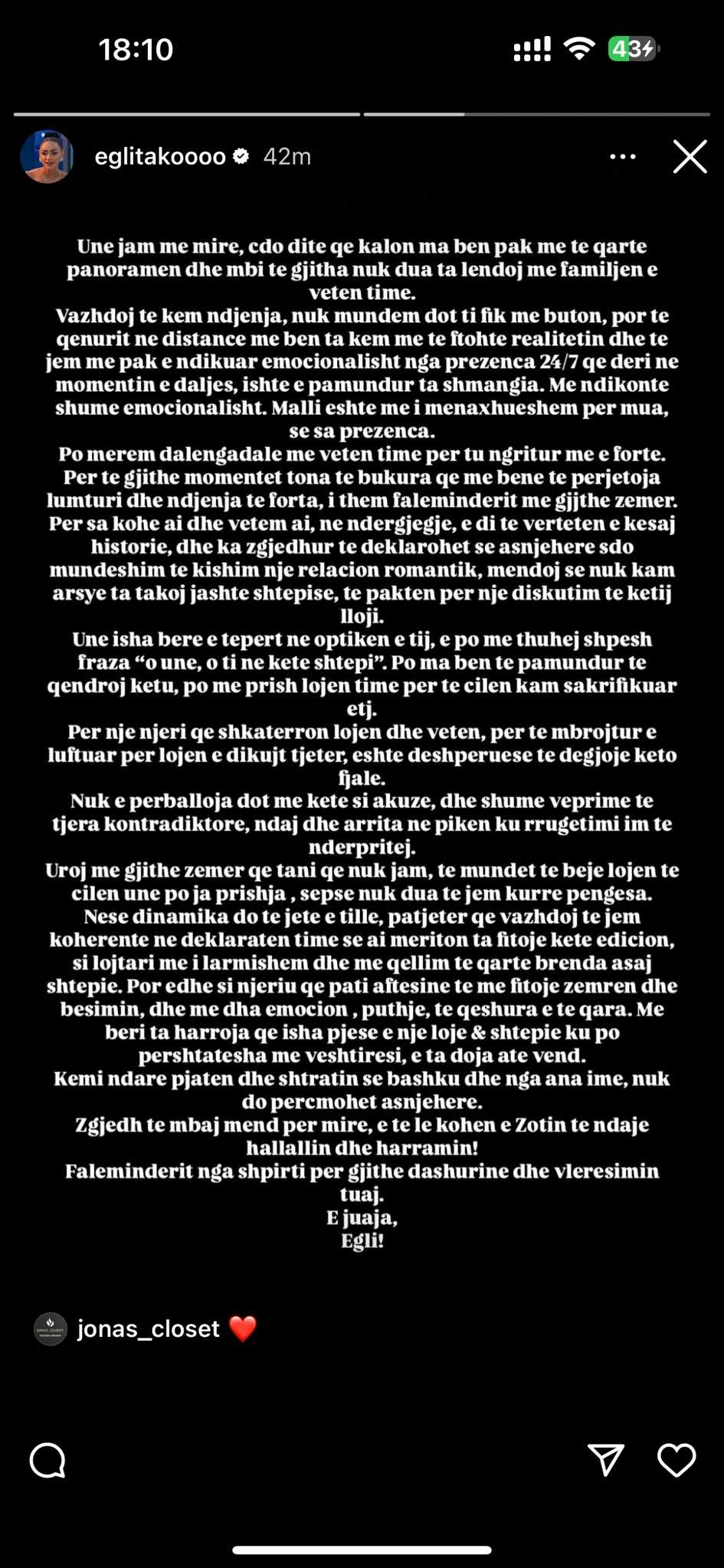 “Ndihem e trishtuar dhe e ngarkuar emocionalisht, por nuk ndodhem në asnjë spital psikiatrik apo diçka të ngjashme. Kam njerëz pranë që po investojnë gjithçka kanë, që unë ta rimarr veten”, shkruan Egli, duke falënderuar ndjekësit për mbështetjen e tyre.