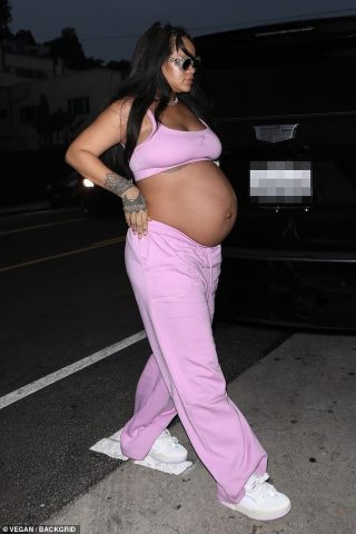 Këngëtarja, 35 vjeçe, e ekspozoi barkun e rrumbullakosur veshur me një palë sytjena sportive rozë “Barbie” dhe pantallona sportiv të njëjtë ndërsa ajo dhe reperi, 34 vjeç, mbërritën për një darkë romantike në Giorgio Baldi.