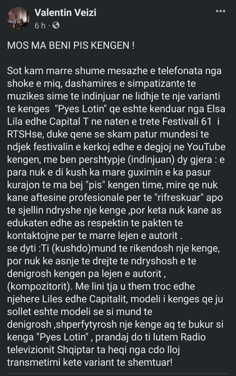 “Këta nuk kanë as edukatën edhe as respektin të paktën të kontaktojnë për të marrë lejen e autorit”, thotë mes tjerash Veizi.