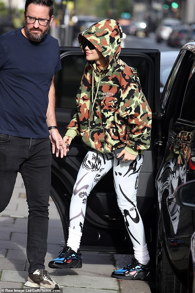 Rita dukej gati për ditën e saj në kryeqytet, teksa doli nga një taksi e veshur me një kapuç me dizajn ushtrie, shkruan DailyMail.