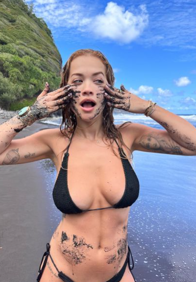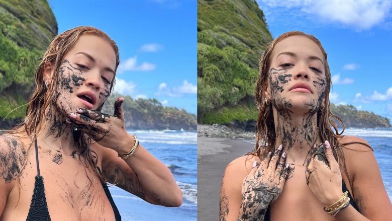 Rita së fundi postoi disa foto teksa shihet e veshur në bikini me ngjyrë të zezë, teksa ka lyer disa pjesë të trupit me rërë.