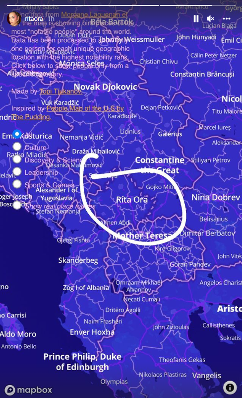 Kjo hartë e quajtur Tjukanovt Github, shfaq emrat e njerëzve të famshëm në qytete e tyre përkatëse të lindjes. E Prishtina me kë tjetër mund të karakterizohej, pos me emrin e të famshmes Rita Ora. Këngëtarja shqiptare me renome botërore është lindur në kryeqytetin kosovar më 26 nëntor të vitit 1991, si fëmija i dytë i prindërve Besnik dhe Vera Sahatçiu.