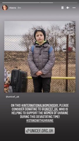 Në Ditën Ndërkombëtare të Gruas, Ora ka shfrytëzuar rrjetin social Instagram për të bërë një thirrje publike duke shpërndarë një nga postimet e UNICEF-it të Mbretërisë së Bashkuar, i cili aktualisht po mbledh fonde për të ndihmuar ukrainasit, transmeton Klankosova.tv.