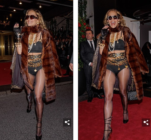 32 vjeçarja, shfaqi fizikun e saj të tonifikuar e veshur me një kordele të zezë, e cila ishte stolisur me shumë zinxhirë ari dhe perla gjithandej.