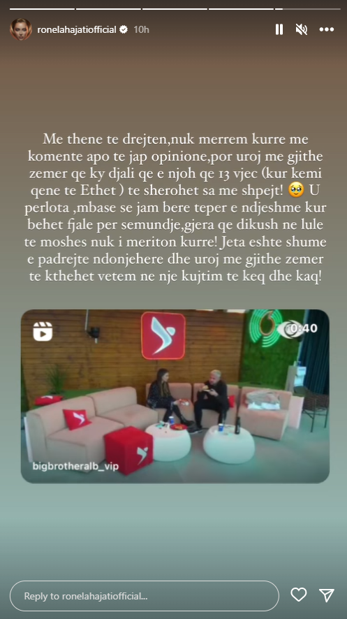 Për këtë pati një reagim nga këngëtarja Ronela Hajati, e cila thotë se e njeh këngëtarin që 13 vjet që kur ishin në “Ethet e së premtes”.