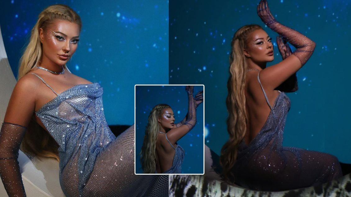 Në imazhe, Ronela pozoi e veshur me një fustan të gjatë ngjyrë të kaltër me shkëlqim, të cilin e përshtati me dorezë të ndgjashme.