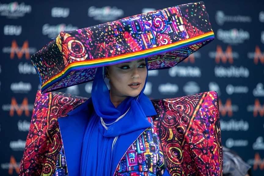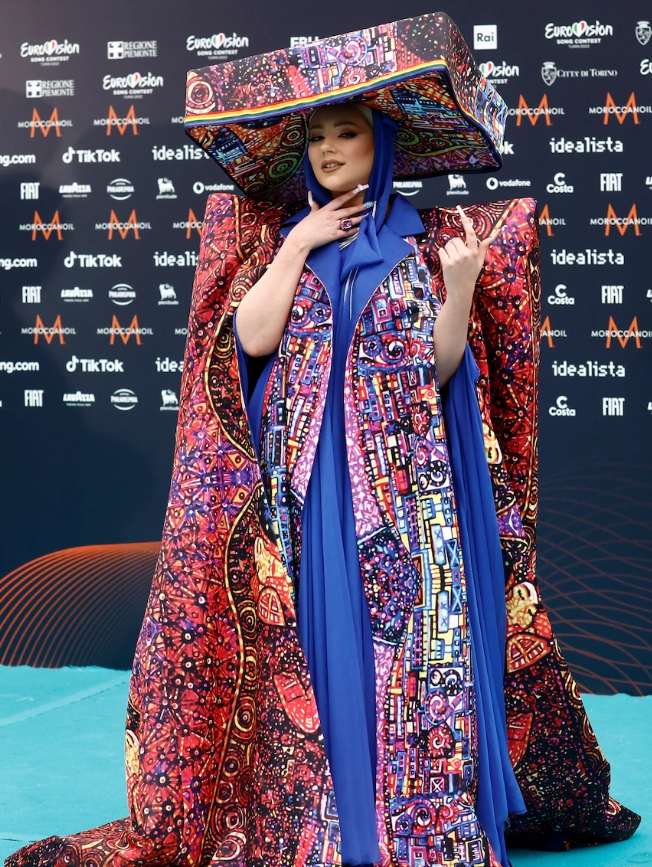 Ronela u shfaq me një veshje tejet ekstravagante, një fustan blu me një dizajn mongol në materialin shoqërues dhe një kapele të madhe në kokë.