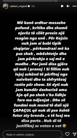 “Me kane ardhur mesazhe pafund, kritika dhe shume njerez te cilet presin një reagim nga unë. Për Kejsin nuk jam ai babi tipik shqiptar, perkundrazi me ka pas shok, mbështetje dhe jam përkrahja e saj me e madhe. Por jane disa gjëra që nuk i pranoj! Si fillim nuk lejoj askënd te perfitoj nga naiviteti dhe ta shfrytëzoj rastin per shoë. Se dyti nuk jam kunder dashurise ama kjo që po shoh s’ka lidhje fare me ndjenjat . Dhe se fundmi nuk mund te dali nje ÇAPAÇUL që nuk di pse është futur aty brenda, e te luaj me disa porta. Nuk di të justifikoj as veten e vet”, shkruan më tej Sabiani.