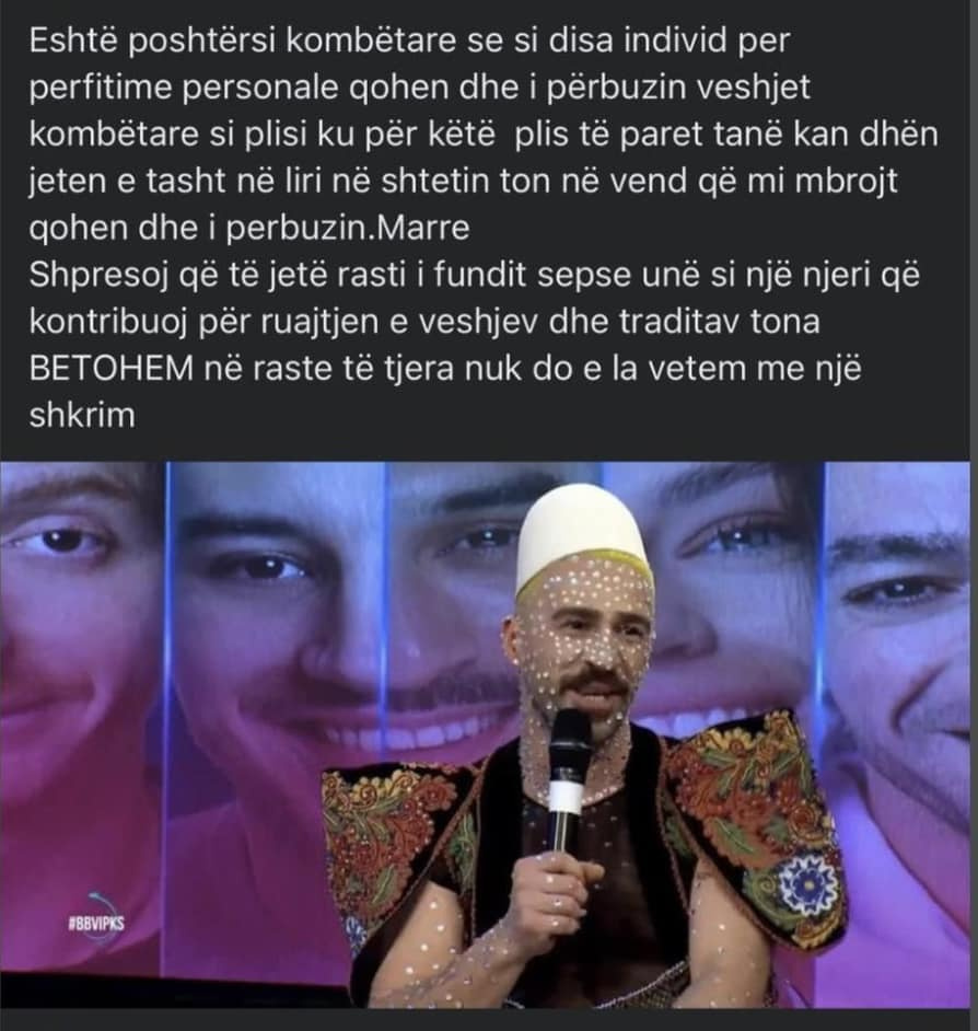 “Është poshtërsi kombëtare se si disa individ për përfitime personale qohen dhe i përbuzin veshjet kombëtare si plisi ku për këtë plis të parët tanë kanë dhënë jetën”, ka shkruar ajo në facebook.