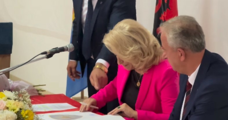 Përmes një videoje në Instagram, Muharremaj ka ndarë një video, ku shihet krah artistes duke nënshkruar titullin nderues./Arbresh.info/