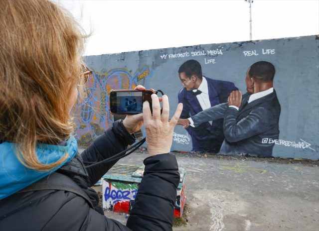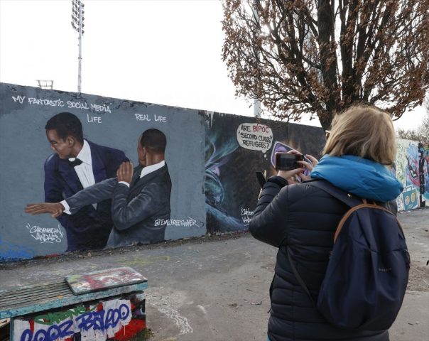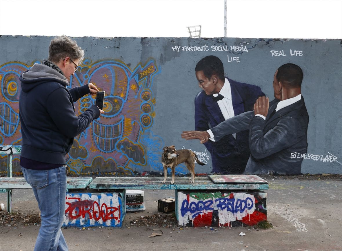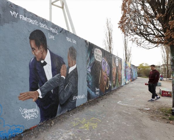 Sot, mbetjet e Murit të Berlinit janë stolisur me vepra të shumë artistëve botërorë të artit të rrugës, duke përfshirë domenikanin Jesus Cruz Artiles, i cili në vizatimin e tij të fundit mbuloi incidentin në Oscars të fundit, gjatë të cilit aktori Will Smith goditi kolegun e tij Chris Rock, shkruan AA, transmeton portal arbresh.info