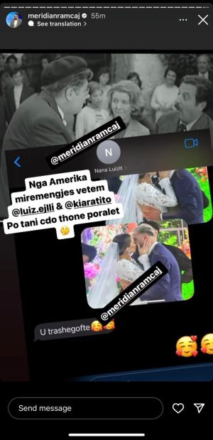 Miku i këngëtarit, Meridian Ramçaj, ka publikuar në Instastory një foto të shkëputur nga mesazhet që ka shkëmbyer me nënë e Luizit. Ish-banori i “BBV1”, i kishte dërguar asaj fotot nga “dasma” e Luizit dhe reagimi i saj ishte mesazh “U trashëgofshin”, shoqëruar me disa emoji plot dashuri.