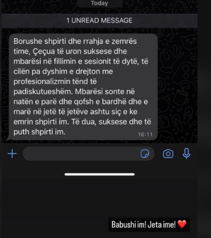“Borushe, shpirti dhe rrahja e zemrës, Çeçua të uron suksese dhe mbarësi në fillimin e dytë, të cilën pa dyshim e drejton me profesionalizim tënd të padiskutueshëm. Mbarësi sonte në natën e parë dhe qofsh e bardhë dhe e marë në jetë të jetëve ashtu siç e ke emrin shpirti im. Të dua, suksese dhe të puth shpirti im”, thuhej në mesazhin e babait të Borës.