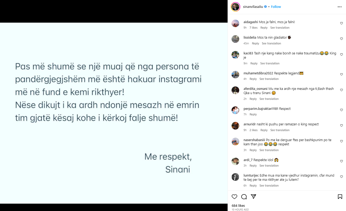 Sinani, së fundi është rikthyer në rrjetin social “Instagram”, pasiqë siç i quajti ai persona të papërgjegjëm ia hakuan llogarinë personale të këtij rrjeti, shkruan arbresh.info