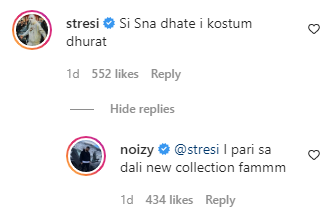 Në një postim në rrjetin social “Instagram” ku shfaqet linja e kostumit, Stresi kërkon një kostum dhuratë, të cilin Noizy ia premton me prioritet, madje duke e quajtur “familje”.
