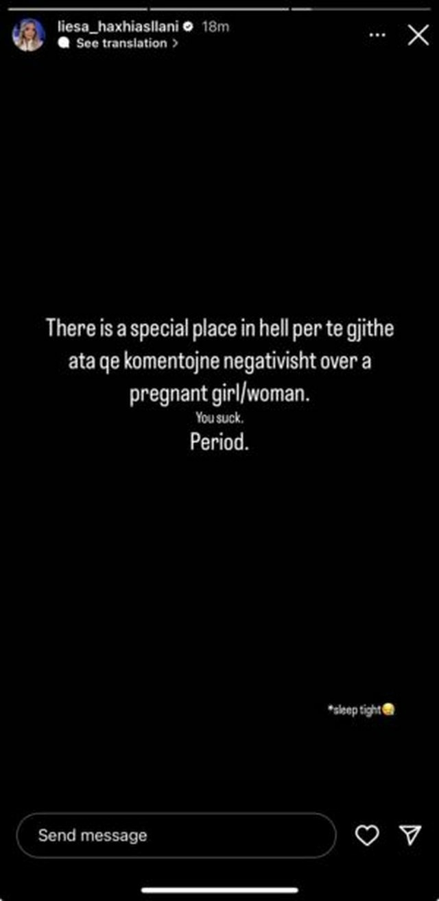 “Ekziston një vend në ferr për ata që komentojnë negativisht për një grua shtatzënë. Ti ta shpif. Gjumë të ëmbël,”-shkruan Liesa në Instagram.