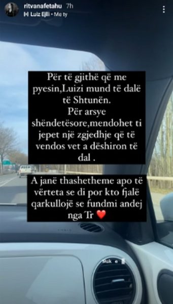 “Për të gjithë që më pyesin, Luizi mund të dalë të Shtunën. Për arsye shëndetësore,mendohet ti jepet një zgjedhje që të vendosë vet a dëshiron të dal”, thotë Ritvana.