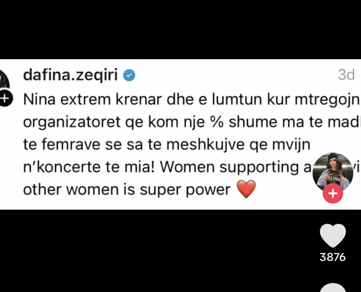 Ditë më parë ishte Dafina ajo që ka shkruar një status, duke thënë se ndihet krenare që në koncertet e saja ka më shumë femra.