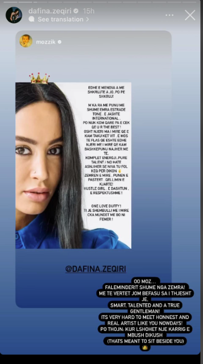 “Osht njeri ma i miri që e kam taku në këtë vit, e mos të flas që është edhe njeri më i miri që kam bashkpunu najhere me të. Komplet energji, pure talent/ no hate. Asnjëherë se niva tu fol keq për dikon”, ka shkruar Mozzik.
