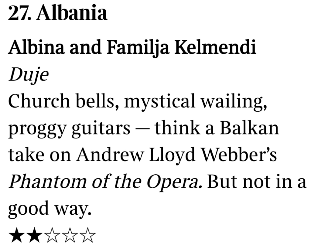 “Vajtim mistik, kambana kishe, mendoni një interpretim ballkanik të “Phantom of the Opera” të Andrew Lloyd Webber. Por jo në një mënyrë të mirë”, shkruan The Times, që e ka vlerësuar këngën dhe performancën me 2 yje nga 5 të mundshmet.