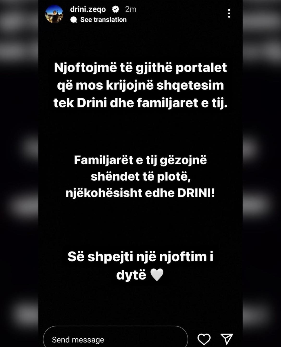 Ndërsa nga Instagrami i tij kanë reaguar duke iu drejtuar portaleve që të mos krijojnë shqetësim tek Drini dhe familjarët e tij, pasi ata gëzojnë shëndet të plotë.