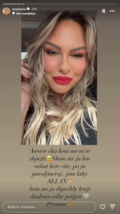 “Çka keni me ‘ni’ së shpejti. S’kom me ju ‘lon’ rehat këtë vit. Po ju paralajmëroj… ‘jom kthy’ ALL IN. Kom me ju ‘shpërbly’ krejt dashninë edhe pritjen. Promise”, shkroi Vesa Luma.