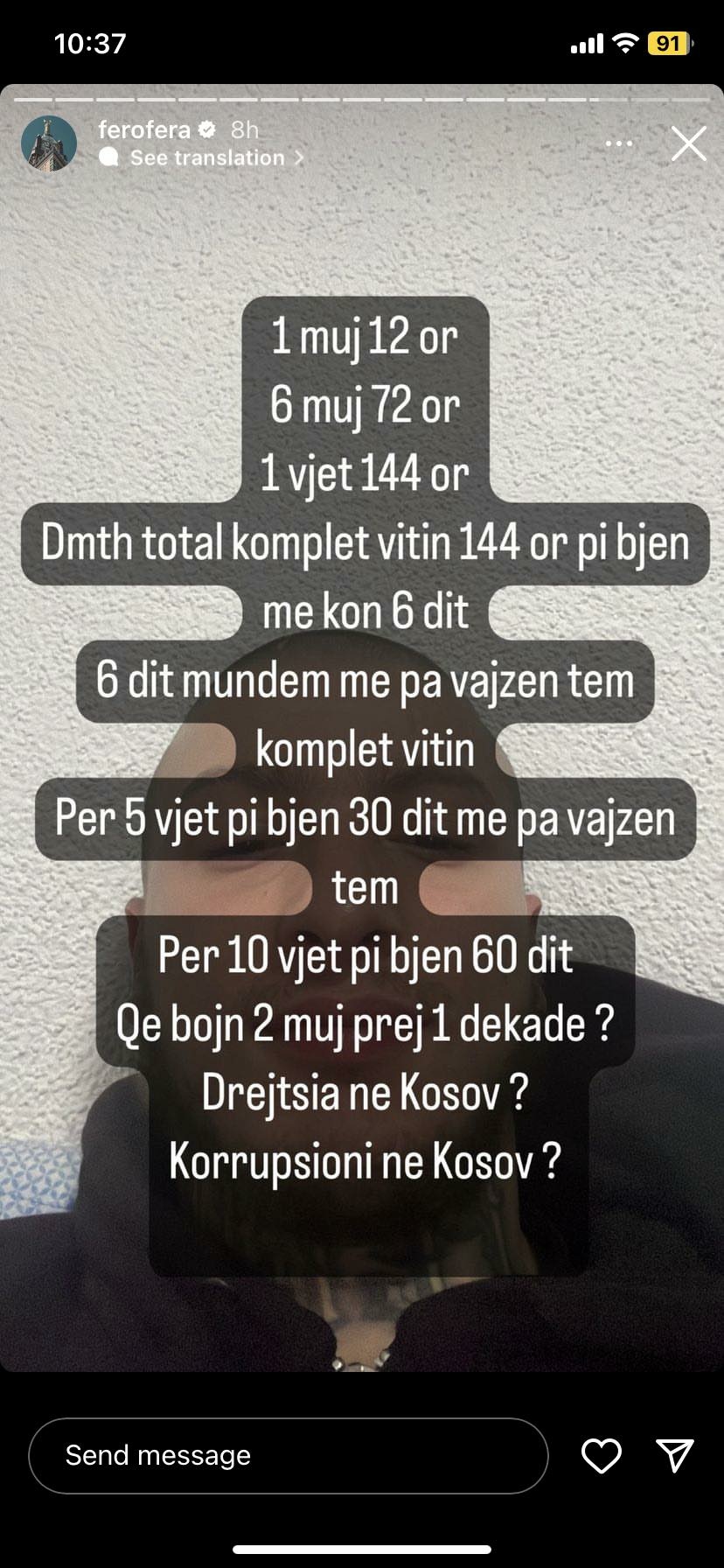 “Një muaj 12 orë, gjashtë muaj 72 orë, një vjet 144 orë. Dmth total komplet vitin 144 orë po i bie me qenë gjashtë ditë. Gjashtë ditë mundem ta shoh vajzën time komplet vitin. Për pesë vjet po i bie 30 ditë ta shoh vajzën time. Për 10 vjet po i bie 60 ditë. Që bëjnë dy muaj prej një dekade? Drejtësia në Kosovë? Korrupsioni në Kosovë”, ka shkruar Fero.