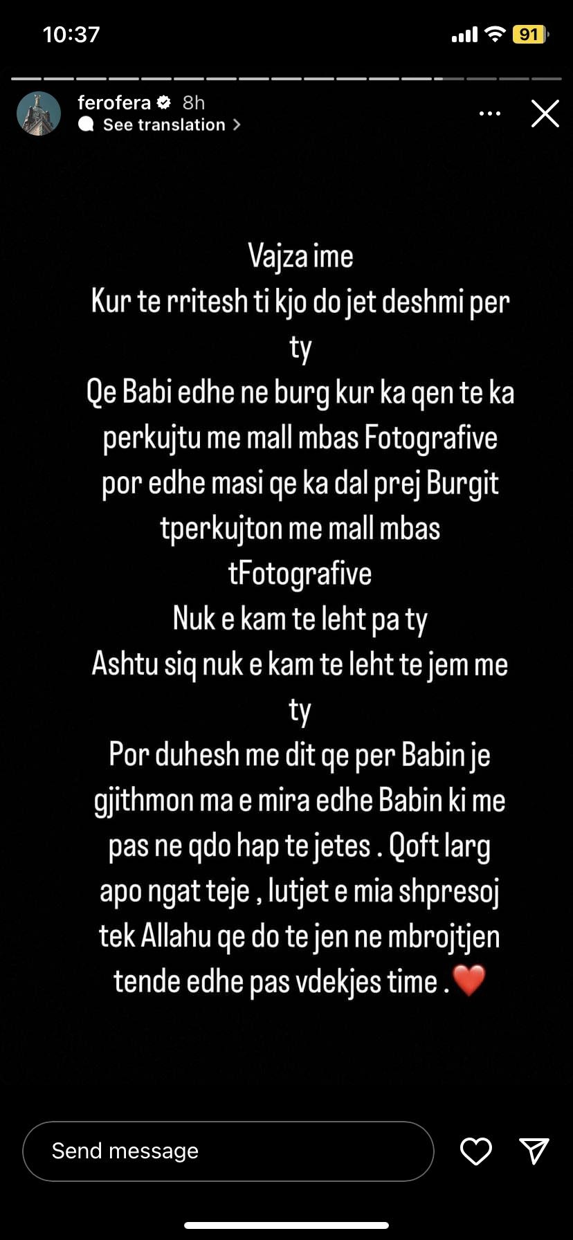 Fero ka ndarë me ndjekësit në InstaStory vendimin e gjykatës, duke shkruar në përshkrimi ne fotografisë: “Dmth unë kam të drejtë ta shoh vajzën time vetëm tri orë në javë edhe me orar të caktuar sipas Ligjit të Kosovës (padrejtësive të gjykatës së korruptuar me avokata), dmth vajza ime i bie të jetë sikur një njeri i huaj për mua”.
