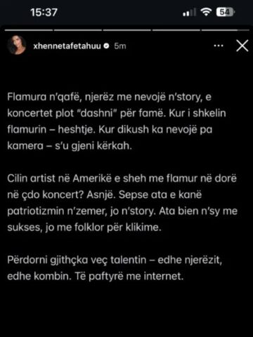 Xheneta Fetahu ka reaguar në rrjetet sociale, duke hedhur një kunjë që duket se i drejtohet këngëtares Egli Tako, e cila së fundmi performoi me flamurin shqiptar mbi supe gjatë një koncerti me tone patriotike.