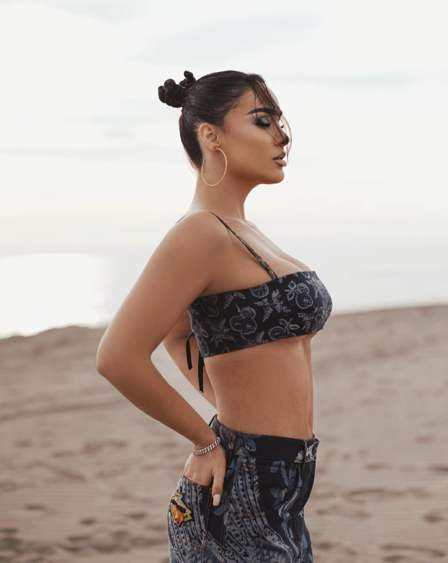 Ajo shfaqet në një plazh dhe e veshur me mjaft stil.