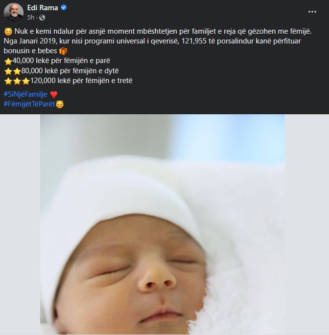 Ndërsa ndau lajmin, kryeministri i Shqipërisë, Edi Rama shtoi se “nuk e kemi ndalur për asnjë moment mbështetjen për familjet e reja që gëzohen me fëmijë”.