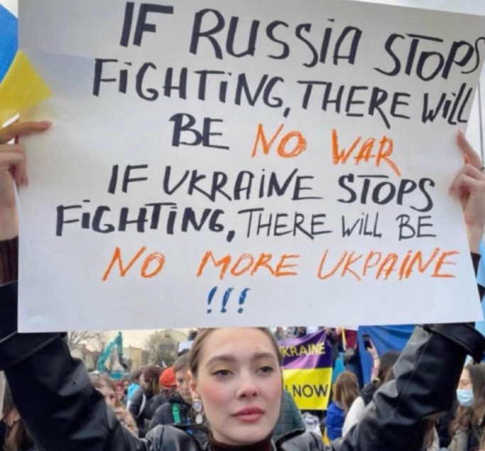 “Nëse Rusia ndalon s’ka më luftë, nëse Ukraina s’lufton s’ka më Ukrainë”, citon Rama atë çfarë shkruhet në pankartën e protestueses.