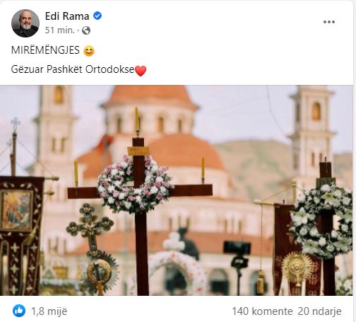Kryeministri Edi Rama ka uruar besimtarët për Pashkët Ortodokse.