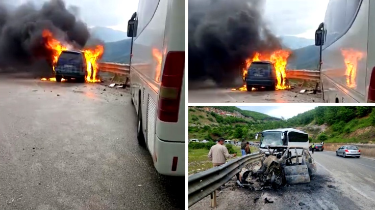 Nga përplasja automjeti, që drejtohej nga një 28-vjeçar u përfshi nga flakët, duke lënë të plagosur 6 personat që ndodheshin në të.