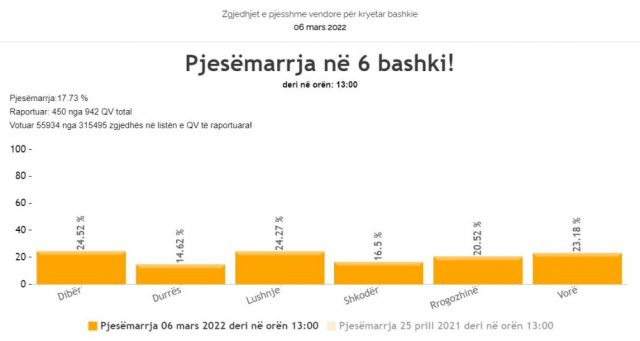 Në shifrat e nxjerra nga KQZ deri në orën 13:00 vihet re një pjesmarrje e vogël në zgjedhje kryesisht në bashkinë e Durrësit dhe të Shkodrës.