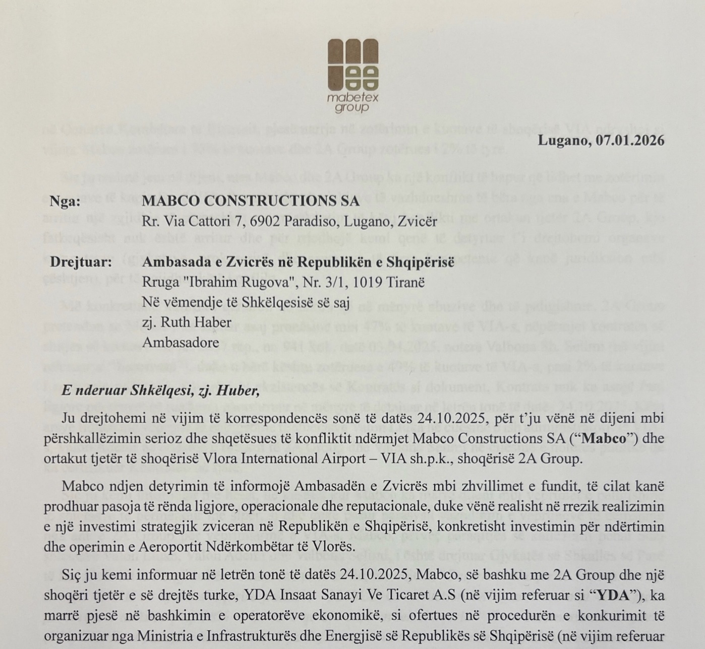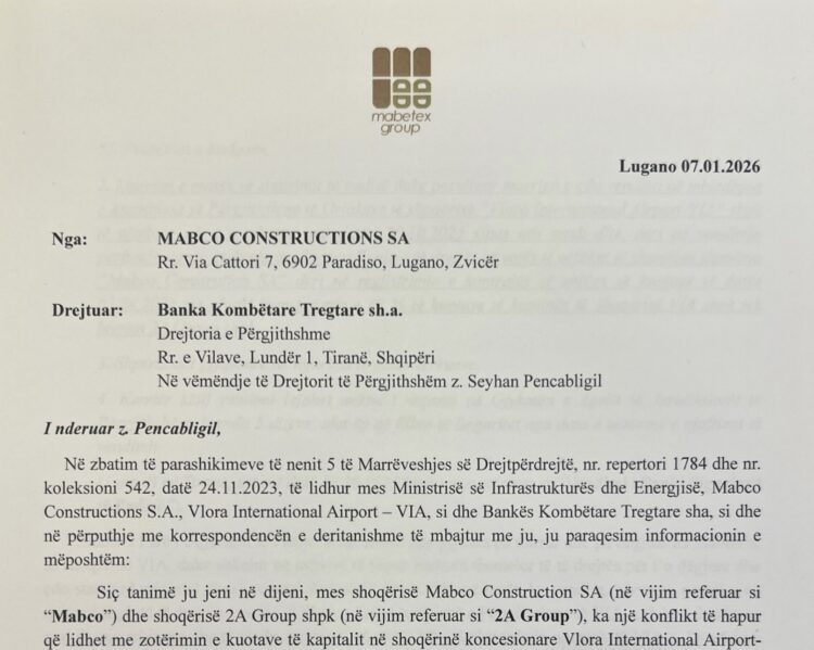 Në një letër zyrtare drejtuar Ministria e Infrastrukturës dhe Energjisë, në vëmendje të ministres Belinda Balluku, MABCO thekson se zotëron 98 për qind të kuotave në VIA dhe se konflikti me ortakën minoritare 2A Group ka prodhuar pasoja të rënda jo për shkak të veprimeve të saj, por për shkak të vendimeve të Gjykatës së Shkallës së Parë. Në dokument thuhet se pezullimi i të drejtës së votës së MABCO “ka paralizuar në tërësi funksionimin operativ të VIA-s”, duke e bërë të pamundur përmbushjen e detyrimeve kontraktuale dhe duke rrezikuar drejtpërdrejt projektin strategjik të aeroportit .