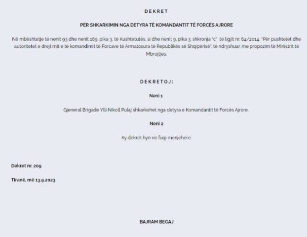 “Në mbështetje të nenit 93 dhe nenit 169, pika 3, të Kushtetutës, si dhe nenit 9, pika 3, shkronja “c” të ligjit nr. 64/2014, “Për pushtetet dhe autoritetet e drejtimit e të komandimit të Forcave të Armatosura të Republikës së Shqipërisë”, të ndryshuar, me propozim të Ministrit të Mbrojtjes, Gjeneral Brigade Ylli Nikoll Pulaj shkarkohet nga detyra e Komandantit të Forcës Ajrore”, theksohet në dekretin e presidentit të vendit, Bajram Begaj.