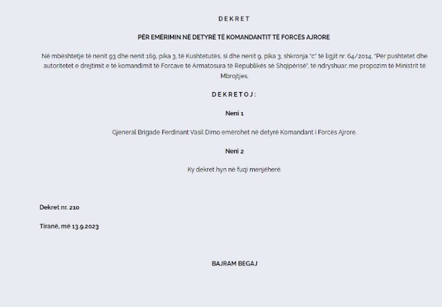 “Në mbështetje të nenit 93 dhe nenit 169, pika 3, të Kushtetutës, si dhe nenit 9, pika 3, shkronja “c” të ligjit nr. 64/2014, “Për pushtetet dhe autoritetet e drejtimit e të komandimit të Forcave të Armatosura të Republikës së Shqipërisë”, të ndryshuar, me propozim të Ministrit të Mbrojtjes, Gjeneral Brigade Ferdinant Vasil Dimo emërohet në detyrë Komandant i Forcës Ajrore” shkruhet në dekretin e presidentit të vendit, Bajram Begaj.
