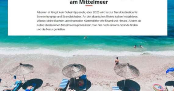Tabloidi gjerman “Bild” i ka bërë Shqipërisë një superpromovim ndërkombëtar mediatik. “Bild” e rendit Shqipërinë në krye të listës së destinacioneve për të udhëtuar gjatë këtij viti. Ministrja e Turizmit dhe Mjedisit, Mirela Kumbaro, nëpërmjet rrjeteve sociale ndau lajmin se nga janari në nëntor të vitit 2024, në vendin tonë hynë 356 mijë vizitorë nga … Continue reading ”Bild”: Shqipëria, në krye të destinacioneve për vitin 2025