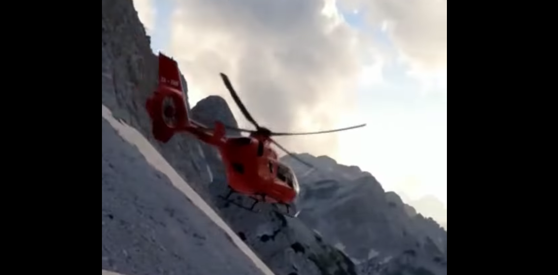 Nga pamjet shihet helikopteri i Forcave Ajrore të Shqipërisë i cili bën evakuimin e alpinistëve në një lartësi prej 2,328 metrash.