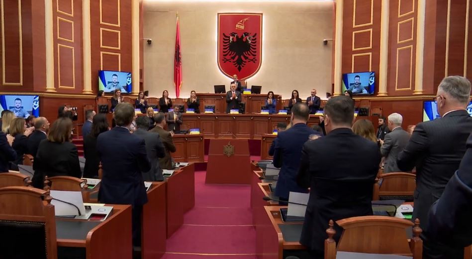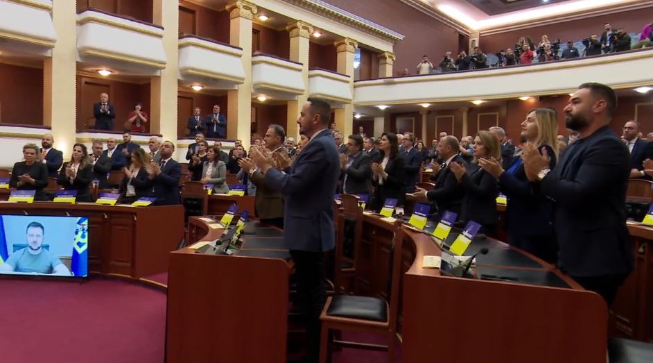 Deputetët shqiptarë janë ngritur në këmbë dhe e kanë duartrokitur fuqishëm fjalimin e presidentit të Ukrainës, Volodymyr Zelensky, në Kuvendin e Shqipërisë.