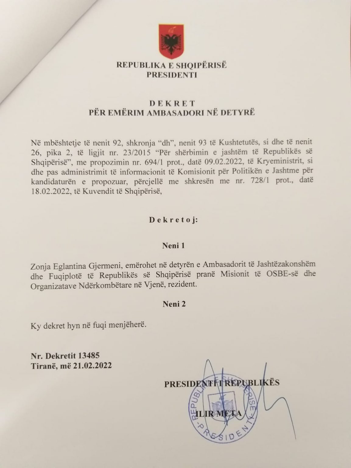 “Eglantina Gjermeni emërohet në detyrën e Ambasadorit të Jashtëzakonshëm dhe Fuqiplotë të Republikës së Shqipërisë pranë Misionit të OSBE-së dhe Organizatave Ndërkombëtare në Vjenë, rezident”, thuhet në dekret.