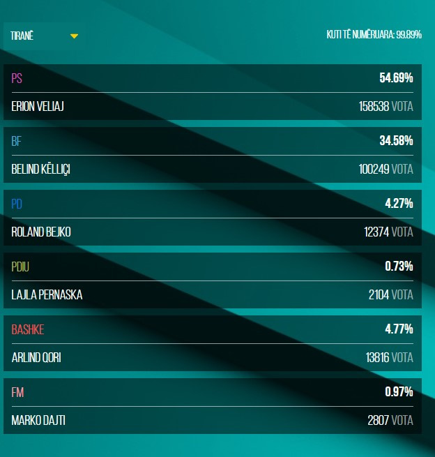 Në rezultatet e orës 08:00 të së martës, Erion Veliaj prin me 54.69 për qind të votave, për dallim nga kandidati i koalicionit “Bashkë fitojmë”, Belind Këlliqi me 34.58 për qind.