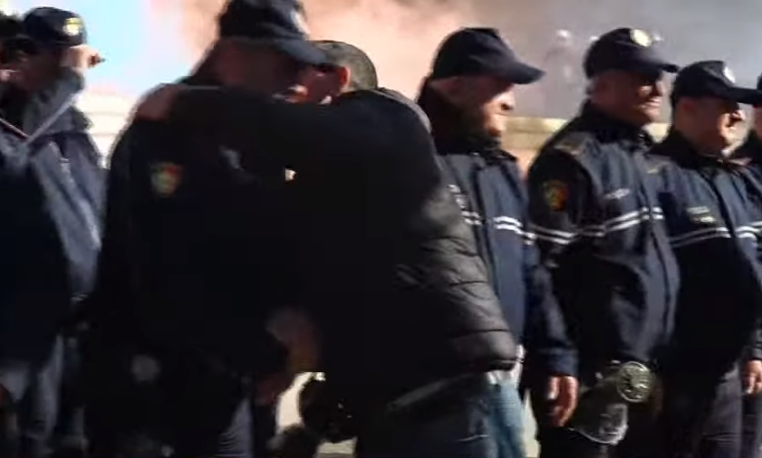 Në pamjet shihet një protestues që përqafon dhe puth punonjësit e policisë, të cilët janë vendosur në kordon para Kryeministrisë.