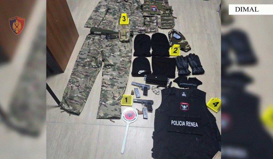Gjatë kontrollit të ushtruar në automjetin dhe në banesën e këtij shtetasi, shërbimet e Policisë gjetën dhe sekuestruan në cilësinë e provës materiale: 2 armë zjarri pistoleta, krehra dhe municion luftarak për to, veshje si të Policisë, maska, dorashka dhe 1 përforcues grushti.