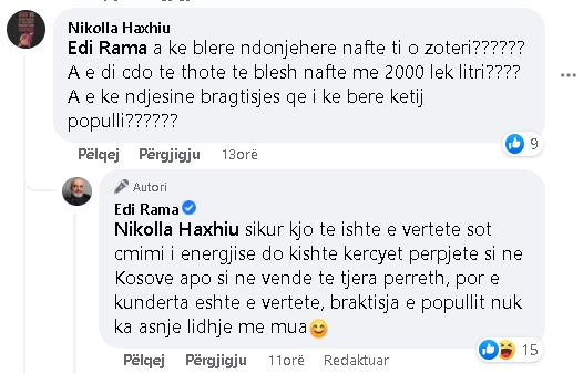 Kryeministri i Shqipërisë, Edi Rama, u ka kthyer përgjigje disa komentuesve në Facebook, lidhur me rritjen e çmimit të karburantit.