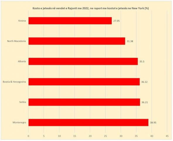 Në raport më rajonin, Shqipëria ishte vendi më i shtrenjtë pas Malit të Zi, Serbisë dhe Bosnjës, teksa më të lira se Shqipëria ishin Maqedonia e Veriut dhe Kosova (shih grafikun bashkëngjitur).