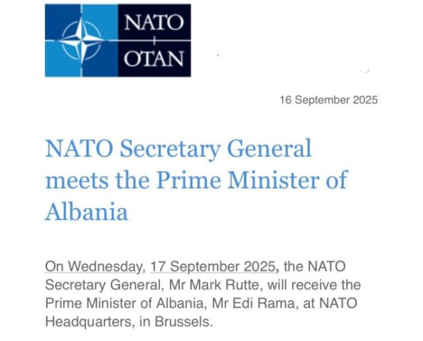 Sekretari i Përgjithshëm i NATO-s, Mark Rutte do të presë në një takim këtë të mërkurë, më 17 shtator, kryeministrin e Shqipërisë, Edi Rama.